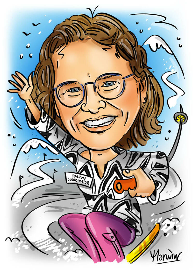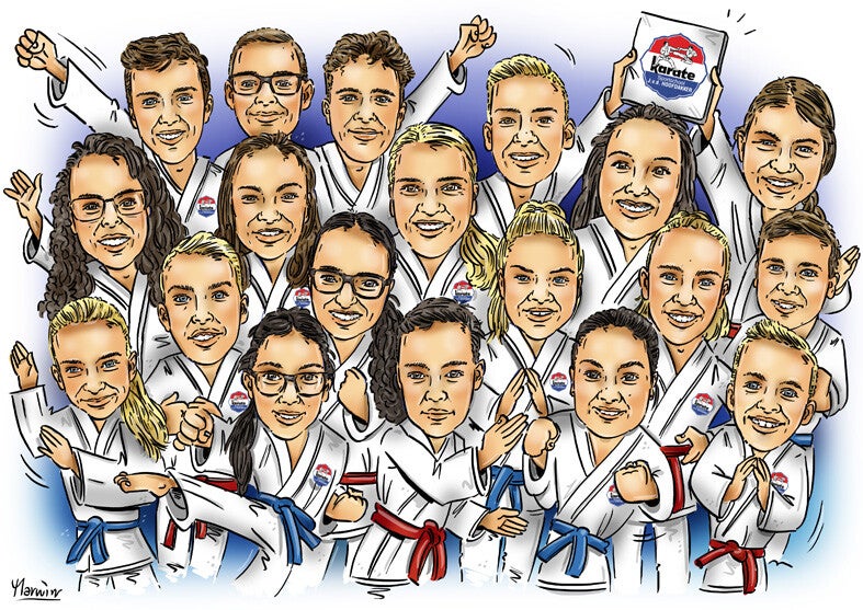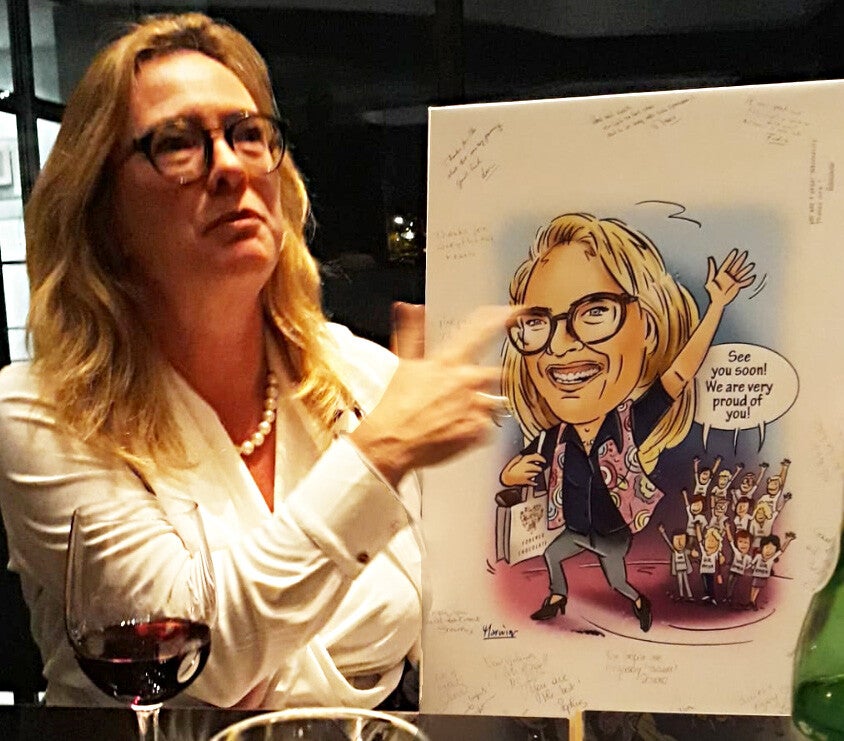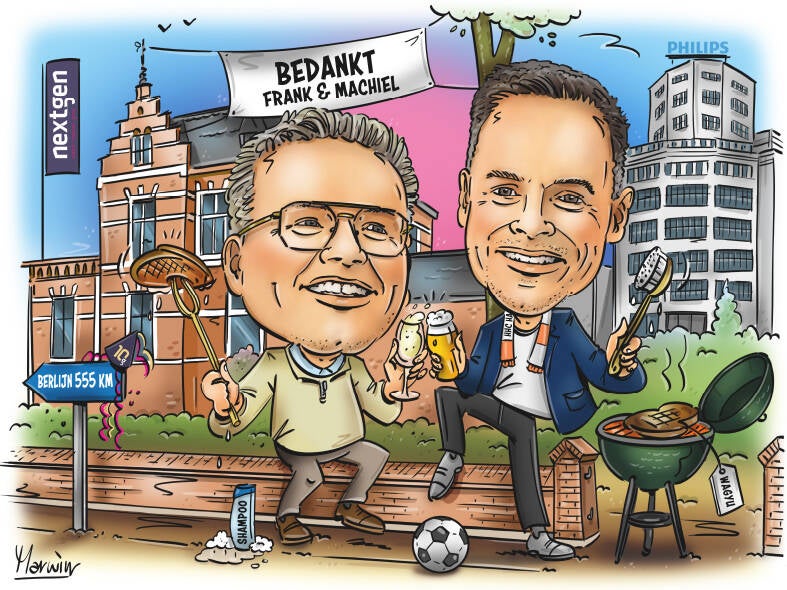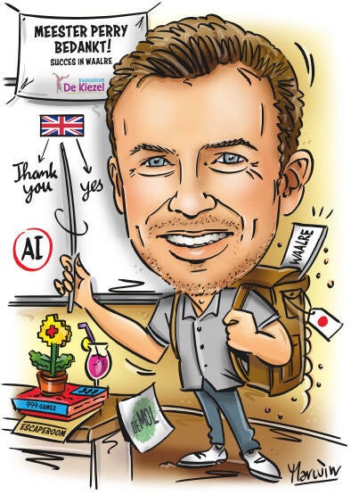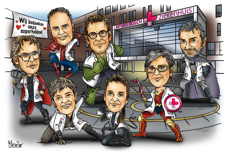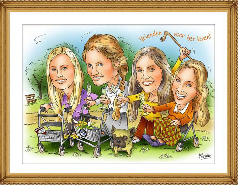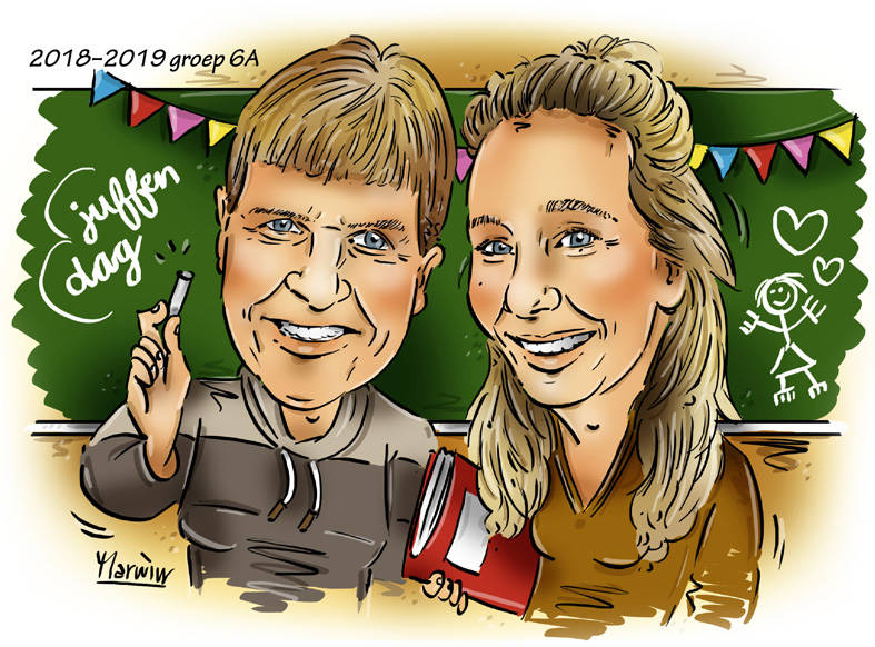 Wij vinden de groepsfoto karikatuur een superleuk idee om aan de school cadeau te doen.
