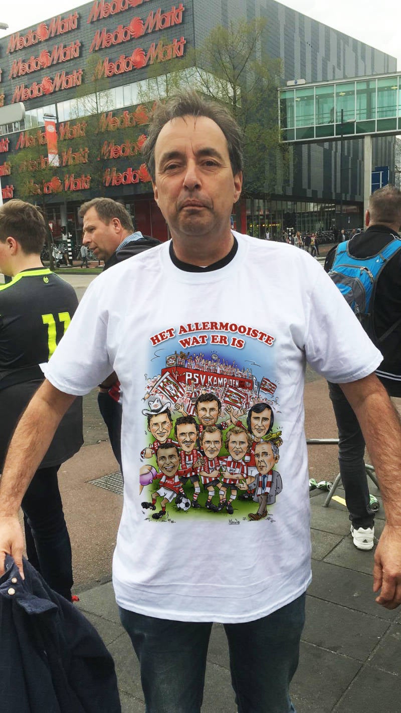 Twee PSV supporters met het kampioensshirt. Als opdruk Jorrit Hendriks met schaal en acht psv legendes.