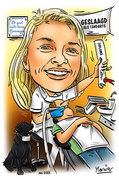 Zoek een geschikte foto van de persoon in kwestie. Mail of app deze door samen met een beschrijving van een aantal kenmerken, hobby’s, beroep, huisdieren, etc. Geef aan op welk formaat je de tekening wilt ontvangen: A4 (210 x 297 mm), A3 (297 x 420 mm), A2 (420 x 594 mm). Binnen een week is je karikatuur klaar en wordt als proef pdf aan je doorgestuurd. Na akkoord wordt deze digitaal of per post naar je toegezonden. Je kunt kiezen om de afbeelding als print of ingelijst te ontvangen of op doek (cancas) te laten zetten. Als T-shirt, mok, dienblad of zelfs als puzzel kan ook. Of gewoon digitaal! Zo eenvoudig is het!