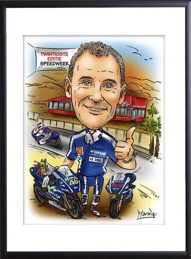 Rechts: Wilco Zeelenberg (voormalig motorcoureur) wordt bedankt voor het organiseren van de twintigste speedweek in Spanje. Hiervoor werd hem een karikatuur op doek overhandigd met bijna 100 handtekeningen eromheen.