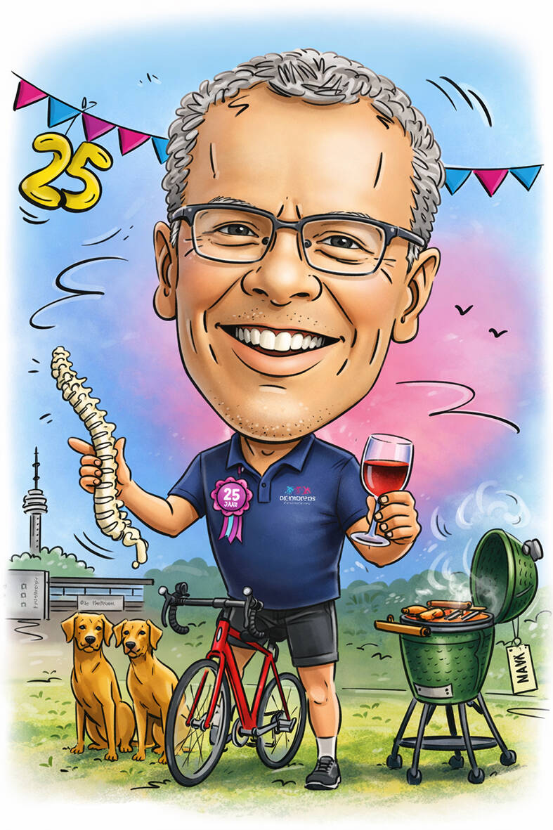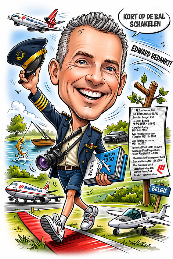 Het toverwoord is tegenwoordig AI (Artificial Intelligence). Ik kan je ook zo’n ’snelle’ karikatuur aanleveren in een stijl die bij jou past. Ook kan ik de karikatuur voor je laten bewegen. Leuk voor op de socials. Hieronder zie je enkele voorbeelden.