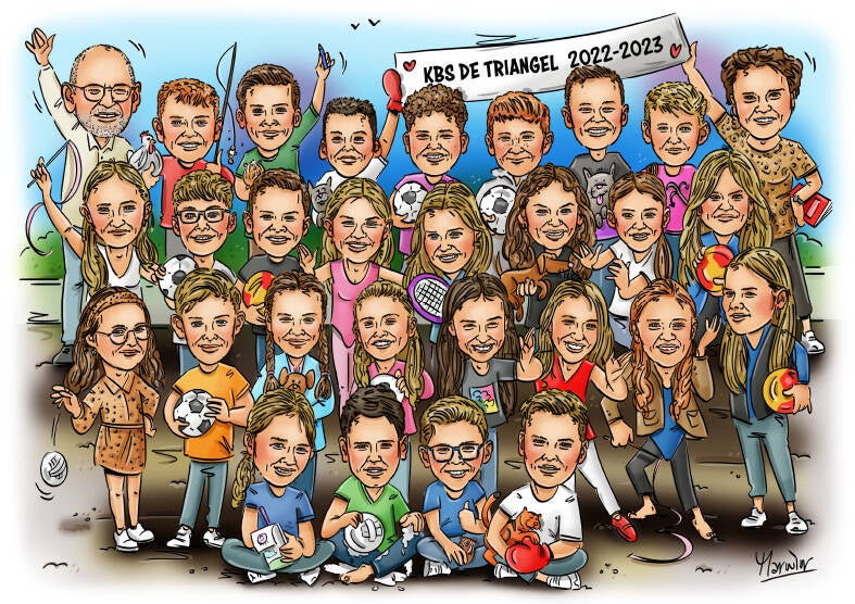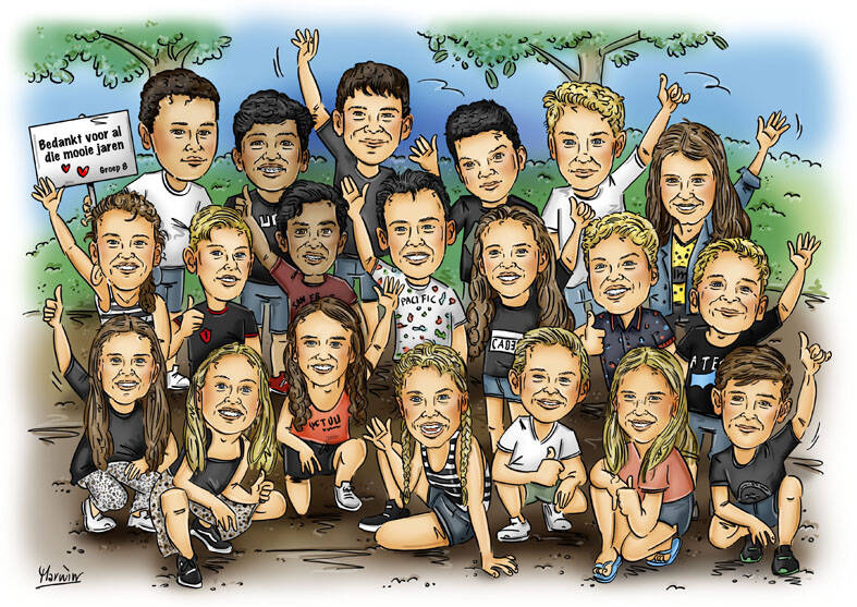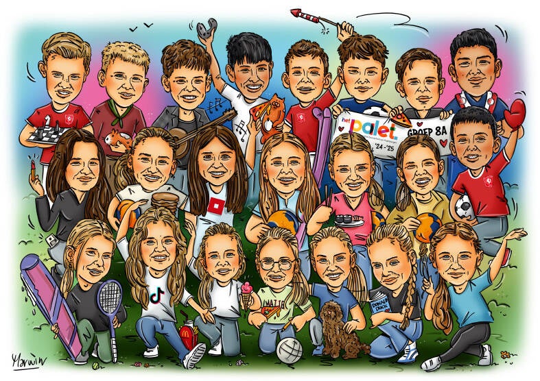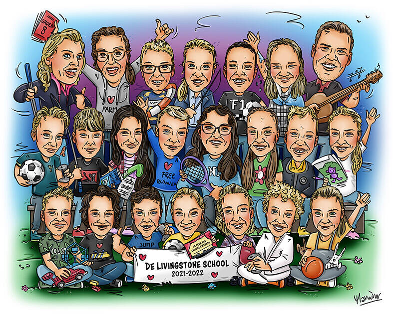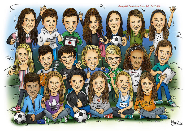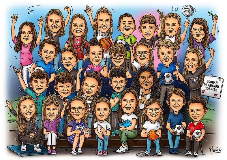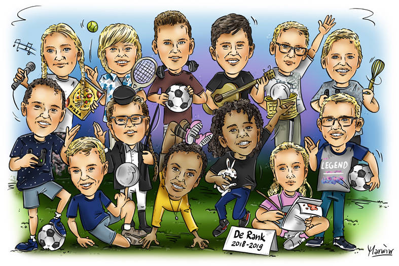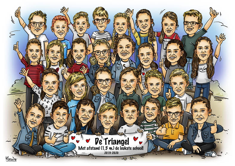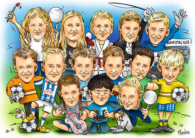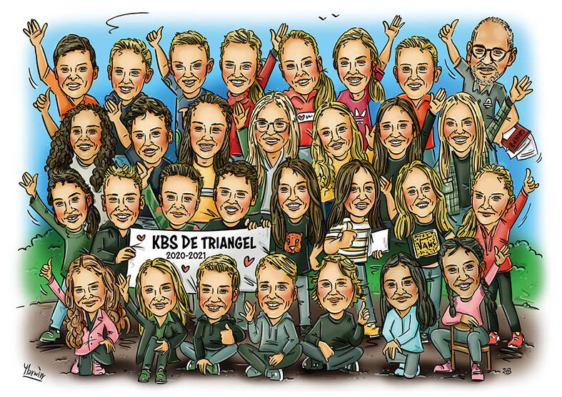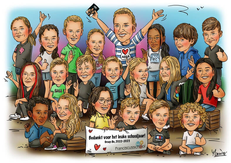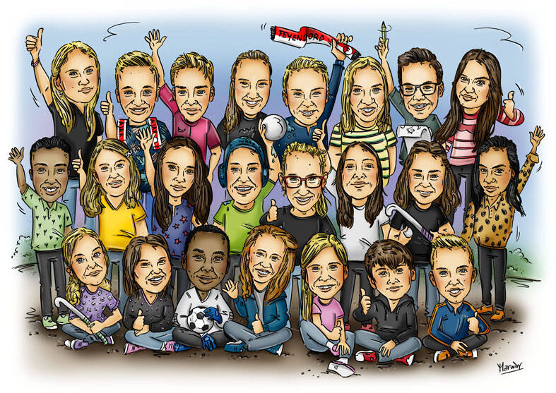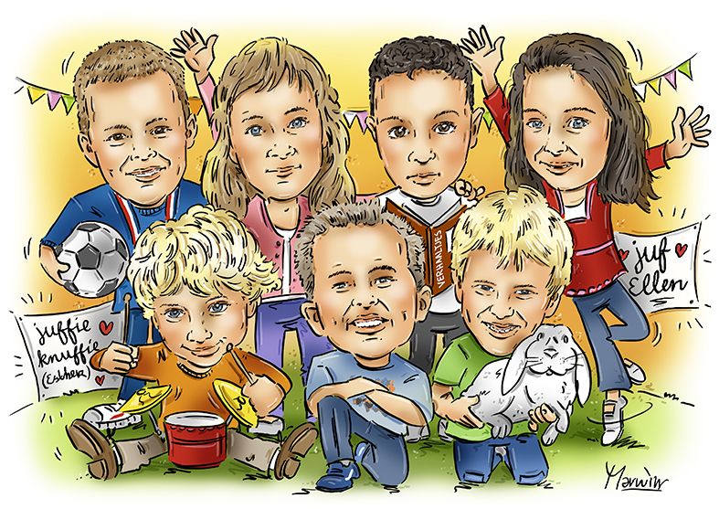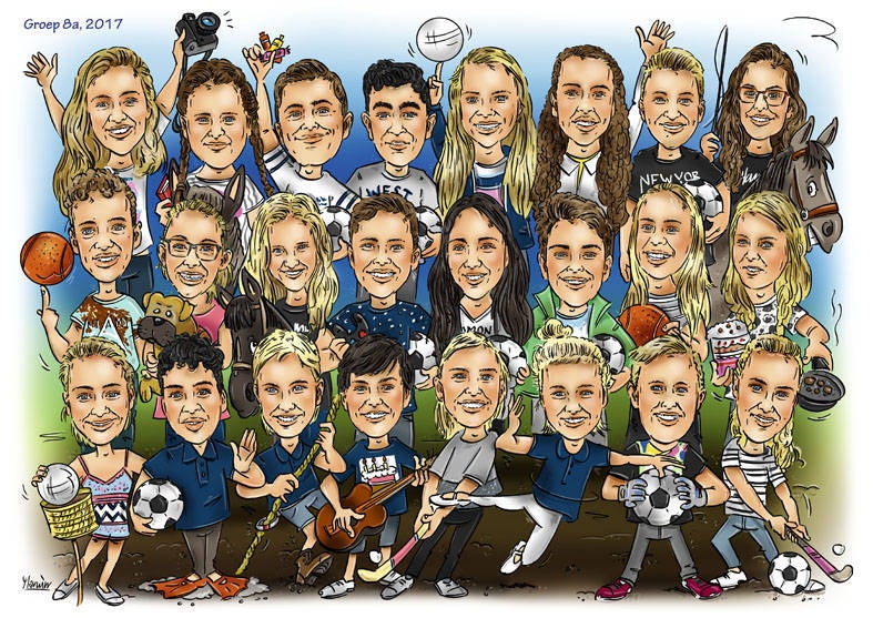 Het is ook mogelijk meerdere mensen in één tekening af te beelden. Bijvoorbeeld met je vrienden, familieleden, collega’s, team of zelfs je hele klas. Hieronder zie je een aantal leuke variaties.