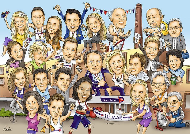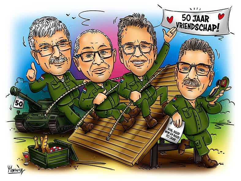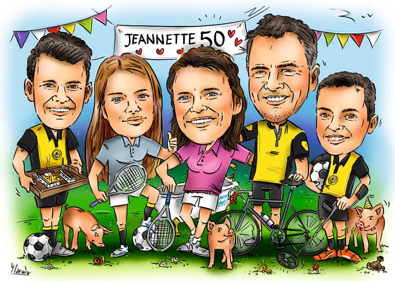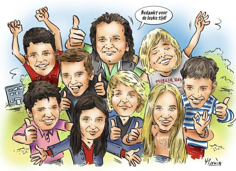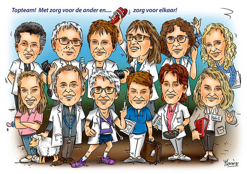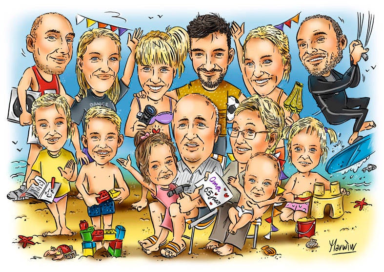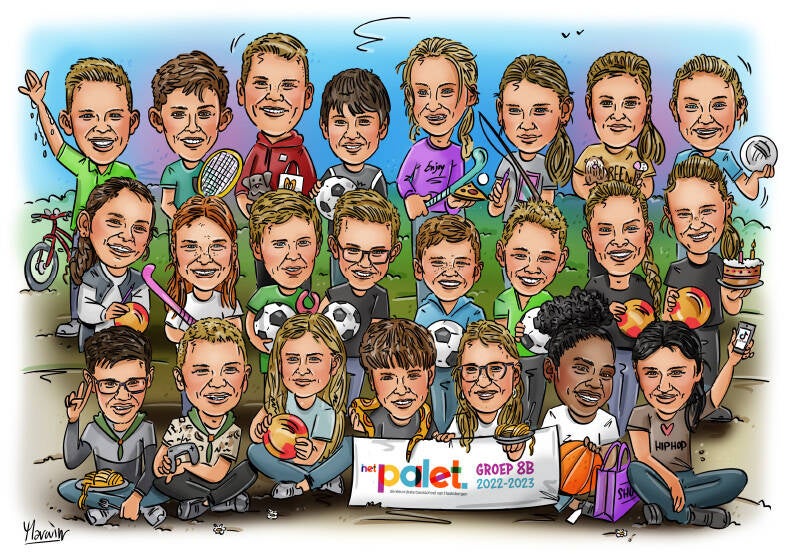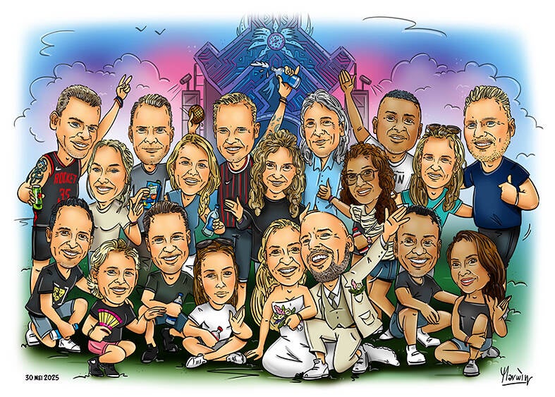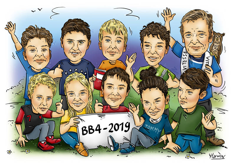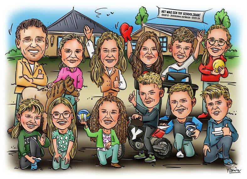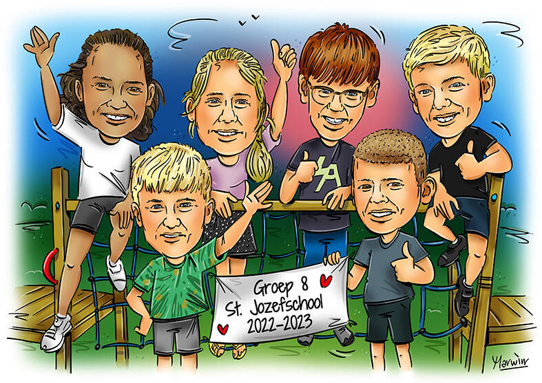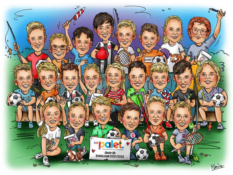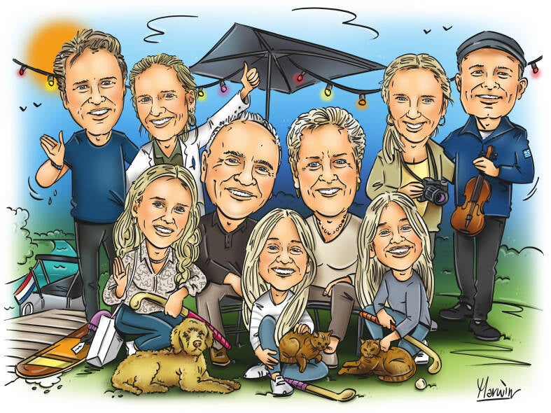 Het is ook mogelijk meerdere mensen in één tekening af te beelden. Bijvoorbeeld met je vrienden, familieleden, collega’s, team of zelfs je hele klas. Hieronder zie je een aantal leuke variaties.