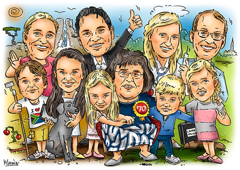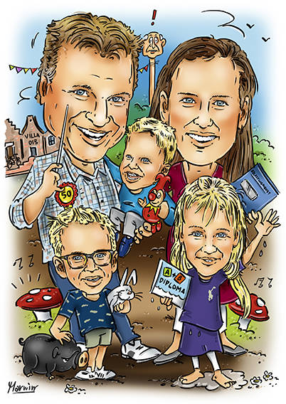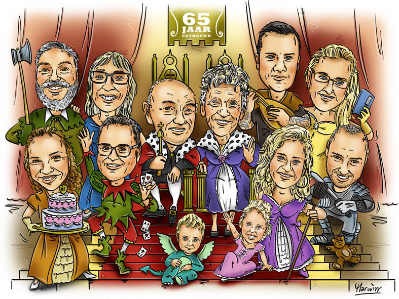 Oma 65 jaar. Kinderen en kleinkinderen gaven deze groepskarikatuur cadeau.