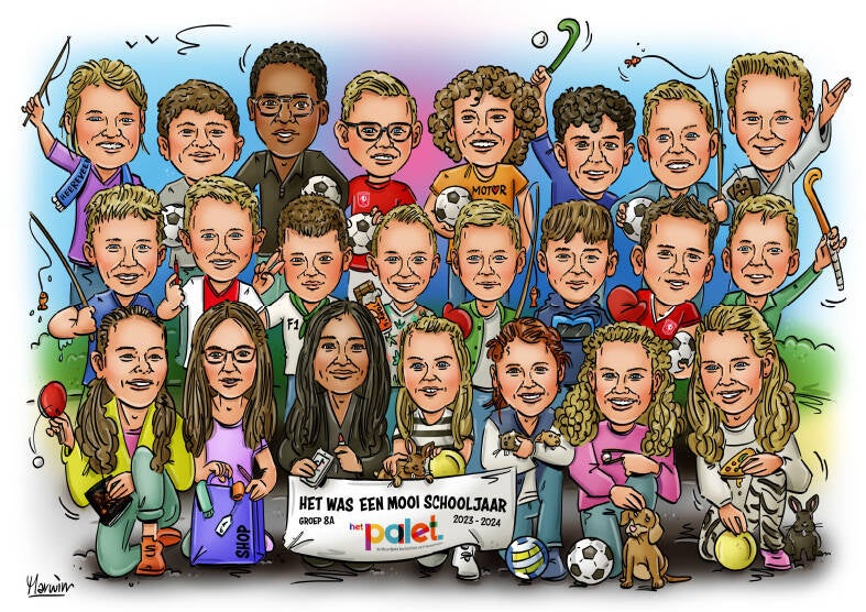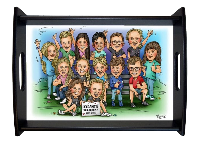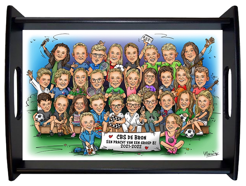 Nieuw: Een groepskarikatuur op een dienblad. Leuk als afscheidscadeau voor groep 8