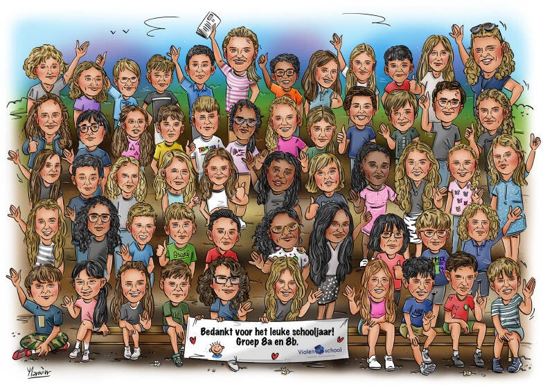 Meestal worden afzonderlijke klassen afgebeeld, maar in dit geval zijn 2 groepen 8 samengevoegd tot één tekening! 54 leerlingen en 1 juf.